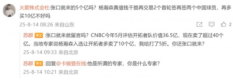 苏群:“张口就来就留言吗?CNBC今年5月评估开拓者队价值36.5亿,现在卖了超过40个亿。当地专家说杨瀚森入选让开拓者多卖了10个亿,我给打了5折。你还张口就来?”